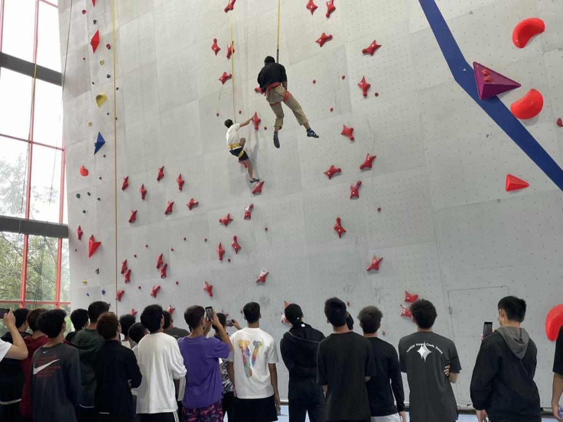 在攀岩馆中,朱昌华老师通过组织新生观看攀岩代表队队员的攀岩展示训练,激发对攀岩运动的向往和兴趣。