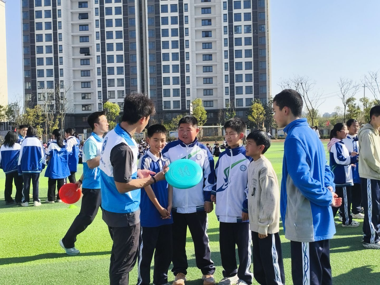 活动中, 大学生志愿者们通过理论讲解、动作示范和互动游戏等方式,向中学生们介绍了飞盘运动的基本规则、投掷技巧和团队协作要点。学生们在志愿者的指导下分组练习,体验飞盘传接、团队配合等环节,现场气氛热烈欢快。不少同学表示,这是他们第一次接触飞盘运动,感觉既有趣又充满挑战。希望通过这样的志愿服务,让更多青少年了解并喜欢上这项运动,同时也展现当代大学生的社会责任感和奉献精神。”